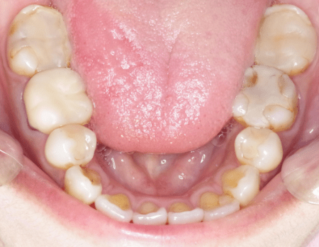 小臼歯を抜歯して矯正したことで残存した小臼歯と大臼歯のかかる負担が大きく破折・虫歯のトラブルを引き起こします。写真では歯列弓が狭くなり舌の置き場所がなく、舌の後退や沈下を引き起こしやすく、息苦しく見えます。